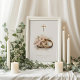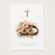 Featuring a beautiful traditional Catholic image of a gold crucifix with two wedding ring accented with flowers. The hearts of Jesus, Mary, and Joseph are on the back. A prayer is also on the back for the bride and groom. All text and fonts can be modified.