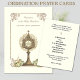 Featuring a beautiful Catholic priest ordination remembrance prayer card with a gold monstrance and the Holy Eucharist adorned with candles and flowers. All text and fonts can be modified.