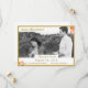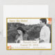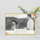 Design features the photo you provide as main design. Heading is displayed at top left in a gold-coloured font against a white rectangular background framed in a thin, golden border. Names of Bride and Groom are featured in same gold text against a white backing as well.