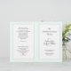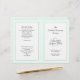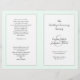 Folded wedding program template for a catholic ceremony. This layered-look program contains white panels over pale mint green colour. Each page has space for lots of text to accommodate an involved ceremony. The last page (back of program) includes a section for scripture (sample is "love is patient" from 1 Corinthians) and a message from the bride and groom.
