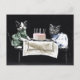 Cute and funny vintage photograph of two dressed cats sitting in a chair on a table, celebrating a birthday with cake and candles.