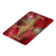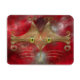 A stylised cat face made of glowing gold curves and curlicues, with wide green-gold eyes, against a red fractal background.