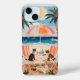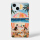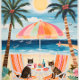 A vibrant beach scene unfolds with two cats lounging under a colorful umbrella. The camera performs a gentle zoom in, highlighting the playful expressions of the cats as they sip drinks. The background features a sparkling ocean and swaying palm trees, creating a tropical paradise. Soft sunlight bathes the scene in warm hues, enhancing the cheerful atmosphere. The composition is lively, with beach accessories scattered around, inviting viewers to immerse themselves in this idyllic setting.