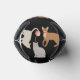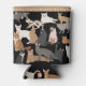 Minimalist style cat art patterned on a black background. Border text reads "meow" looping around the can cooler.