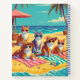 Journal in five stylish cats relax on a sunny beach, lounging on striped towels under palm trees. They wear colourful sunglasses and straw hats, enjoying a tropical vacation, with a turquoise sea and bright blue sky behind them.