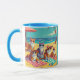 Mug in five stylish cats relax on a sunny beach, lounging on striped towels under palm trees. They wear colourful sunglasses and straw hats, enjoying a tropical vacation,  with a turquoise sea and bright blue sky behind them.