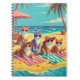 Notebook in five stylish cats relax on a sunny beach, lounging on striped towels under palm trees. They wear colourful sunglasses and straw hats, enjoying a tropical vacation, with a turquoise sea and bright blue sky behind them.