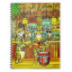 Notebook in a tropical-themed illustration depicting cats in a tiki bar. Dressed in vibrant Hawaiian shirts, one cat plays a ukulele and stands near a red drum, while others enjoy cocktails. The bar features bamboo decor, tiki masks, and palm fronds, for a festive, island atmosphere.