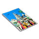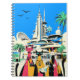 Notebook in an illustration of three stylish, cats dressed as tourists standing before a futuristic cityscape. The architecture evokes mid-century sci-fi aesthetics. The cats hold cameras, maps, and wear lanyards, suggesting adventure. Palm trees and a bright blue sky enhance the vacation atmosphere.