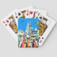 Playing Cards in an illustration of three stylish, cats dressed as tourists standing before a futuristic cityscape. The architecture evokes mid-century sci-fi aesthetics. The cats hold cameras, maps, and wear lanyards, suggesting adventure. Palm trees and a bright blue sky enhance the vacation atmosphere.