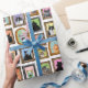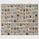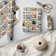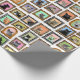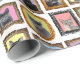 An assortment of distinctive cat head pictures in wooden frames on this colourful wrapping paper.