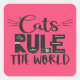 Fun and lovely modern pink sticker featuring the words "Cats rule the world", decorated with white whiskers, cat scratches, a tiny mouse, and a little paw.