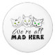 We're All Mad Here text and drawing of three funny cat faces with yellow and green eyes. T-shirts, tank-tops and other items of apparel for men, women, kids and babies. More square format products and gifts