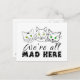 We're All Mad Here text and drawing of three funny cat faces with yellow and green eyes. Horizontally orientated or landscape aspect ratio products and souvenirs