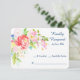 A bright and colourful floral and cattail bouquet is at the top left corner of this pretty wedding response card. Colours in the bouquet include coral pink, light violet pink, white, pale yellow and gold, and green, with a touch of aqua blue. Your custom text is at the right in blue. The image and text are placed on a white background to make it easy for your respondent to mark their choice. The back of the card is navy blue. This card matches invitations and other wedding products in our store.