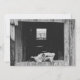 Black and white image of an old cattle ranch, on a big island of Hawaii, with a cow skull resting in the window cut out.