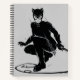 This striking graphic captures Catwoman in her element, showcasing her agility and stealth as she prepares for action. The illustration is rendered in bold black and white, emphasizing the sleekness of her costume and the dynamic movement of her pose. Catwoman is depicted crouching with a whip coiled at her side, her gaze focused and calculating. The splattered ink effect around her adds a sense of urgency and the chaotic environment in which she thrives. This artwork not only highlights Catwoman's iconic status as a skilled thief and anti-heroine but also her complex relationship with Gotham and its dark knight. It's a powerful portrayal of one of Batman's most enigmatic and formidable allies and adversaries.