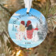 Celebrate your first Christmas together with this fun illustration of a blonde and dark haired Caucasian lesbian couple sitting with their backs to you framed by a pretty winter wonderland forest landscape scene that has snow laden fir trees and a cute snowman wearing a Santa hat in it. They are wearing ugly Xmas sweaters and red and white Santa hats. The words, our first Christmas followed by the year, appear on the front and the back and there is a photo template for you to personalise