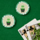 This awesome set of poker chips features a graphic image of a grey cauldron. The cauldron is full to the top with a green potion brewed by a witch. The potion is bubbling out of the cauldron and has formed the word "bubble" which appears twice above the poisonous looking brew.