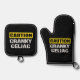 Fun black oven mitt and pot holder with a warning sign saying CAUTION CRANKY CELIAC. Perfect gift idea for Celiacs.