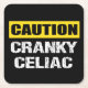 Fun black coaster with a warning sign saying CAUTION CRANKY CELIAC. Perfect gift idea for Celiacs.