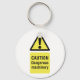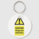 A yellow sign that says caution dangerous machinery. This design looks really effective on these Keychain