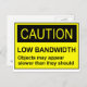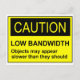 This yellow low bandwidth warning sign cautions that “objects may appear slower than they should.” That’s the effect of not having enough line or network speed. Everything on the computer screen takes way to low to resolve. Then, again, some of your co-workers may also be of the low bandwidth variety and also appear to be in slow motion.