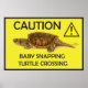 Caution turtle crossing sign. Help people keep aware that the turtles may be crossing the sidewalk, trail or walking paths. Image of a snapping turtle.