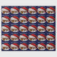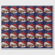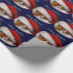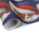 This is a roll of blue, Christmas wrapping paper that features an enchanting, original photograph of a blenheim Cavalier King Charles Spaniel puppy, sleeping with a Santa hat on.