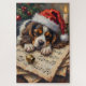 This romantic storybook illustration features a peaceful Tricolor Cavalier King Charles Spaniel, wearing a Santa hat and fast asleep on a pile of antique Christmas carol sheet music. A gentle and nostalgic holiday design for CKCS lovers.