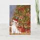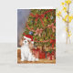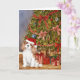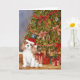 This Christmas card features a watercolor portrait of a Cavalier King Charles Spaniel dog wearing a Santa hat sitting under a Christmas tree.