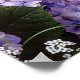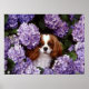 Cavalier King Charles Spaniel puppy dog peeping out of a floral bed of purple flowers.