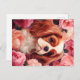 A close-up portrait of a blenheim Cavalier King Charles Spaniel puppy, rendered in a painterly style. The dog has a white and brown coat, with large, expressive brown eyes. It is surrounded by a profusion of pink and peach roses, creating a soft and romantic atmosphere. The dog's fur is depicted with meticulous detail, capturing the texture and flow of its long, silky hair. Perfect gift for cavie lovers.