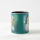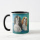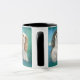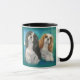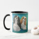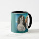 This is a ceramic mug, featuring a photograph of an original painting of two Cavalier King Charles Spaniels, one Tri-colour, and the other Blenheim, sitting together with a blue/green background.