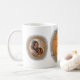 Two custom photos and your dog's name come together in this pastel orange watercolor mug. A subtle breed silhouette accents the verse: 'Warm sun dances upon gentle eyes and noble hearts', creating a peaceful gift for pet parents.