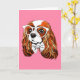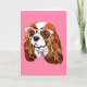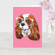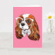 This design features a portrait of a Cavalier King Charles Spaniel wearing glasses and a bow tie on a pink background.