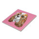 This design features a portrait of a Cavalier King Charles Spaniel wearing  glasses and a bow tie on a pink background.