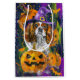 Embrace the Halloween spirit with this enchanting design featuring a cute dog in a witch hat surrounded by carved pumpkins. Perfect for adding a touch of spooky charm to your festive celebrations.