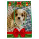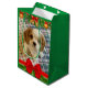 This is a medium sized, festive Holiday Gift Bag featuring an original photograph of a tiny, adorable Blenheim Cavalier King Charles spaniel puppy sitting on his favorite blanket.