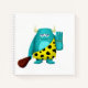Little teal coloured cartoon monster with horns and blue eyes, wearing a yellow and black loincloth, carrying a wooden club in one hand and waving with the other.