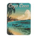 A vibrant and nostalgic depiction of Cayo Coco, Cuba, a tropical paradise known for its pristine white-sand beaches, turquoise waters, and lush mangroves. The design captures the idyllic beauty of the island, with its secluded shores, luxury resorts, and crystal-clear Caribbean Sea. Rendered in a vintage style, the artwork evokes the relaxing atmosphere and natural splendour of Cayo Coco, inviting viewers to explore its tranquil beaches, diverse wildlife, and vibrant marine life.