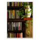This note card features a colourful composition of four shelves of compact discs beside an oriental vase with a green vine. The vertical lines of the cds contrast with the graceful curves of the vase to form an interesting abstract design.