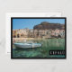 Postcard of two boats in the old small port of Cefalu, an old town with crooked houses on the waterfront and a small city beach on the north coast of Sicily, island in Italy with a black edge and the text: 'Cefalù'.