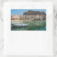 Rectangular photo sticker with two boats in the old small port of Cefalu, an old town with crooked houses on the waterfront and a small city beach on the north coast of Sicily, island in Italy.