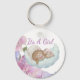 Celebrate Baby Shower Its a girl keychain. Featuring a sweet, hand-drawn illustration of a baby girl peacefully sleeping on a soft, fluffy cloud, this design is framed by a delicate border of watercolor flowers in shades of lavender, purple, and soft pink.