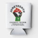 Celebrate Freedom JUNETEENTH can cooler with stylish Freedom Power Fist in Pan African colours of red, black and green, with a yellow drop shadow and plain white background. The curved heading says JUNETEENTH in bold black typography. The text underneath says CELEBRATE FREEDOM plus NEVER AGAIN BOUND BY THE YOKE OF SLAVERY and this quote is based on the Christian Bible verse Galatians 5:1. This text is CUSTOMIZABLE so you can replace with your name or with your own inspirational quote. This Pan African Juneteenth can cooler would make an ideal gift for Juneteenth, Christmas, Birthdays, Black History Month, and throughout the year whenever Black independence and African American Caribbean cultural pride are celebrated. Choose from a wide selection of Juneteenth designs on clothing, home decor, cards and gifts, original designs by Berean Designs.
