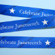 Celebrate Juneteenth this year with this custom ribbon which features the words celebrate Juneteenth on a blue ribbon. Behind this are faint broken chains in the background.