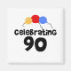 Three primary colours balloons and black text that reads "Celebrating 90" on 90th birthday cards, T-shirts, mugs, and more.