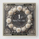 A beautifully designed anniversary card displays an elegant wreath made of cream flowers and intricate patterns. The spotlight is on the text marking the first anniversary, evoking feelings of love and celebration.