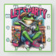 A stylish frog enjoys a drink, wearing sunglasses and a hat, while relaxing with a skateboard. Vibes are festive in a lively atmosphere.